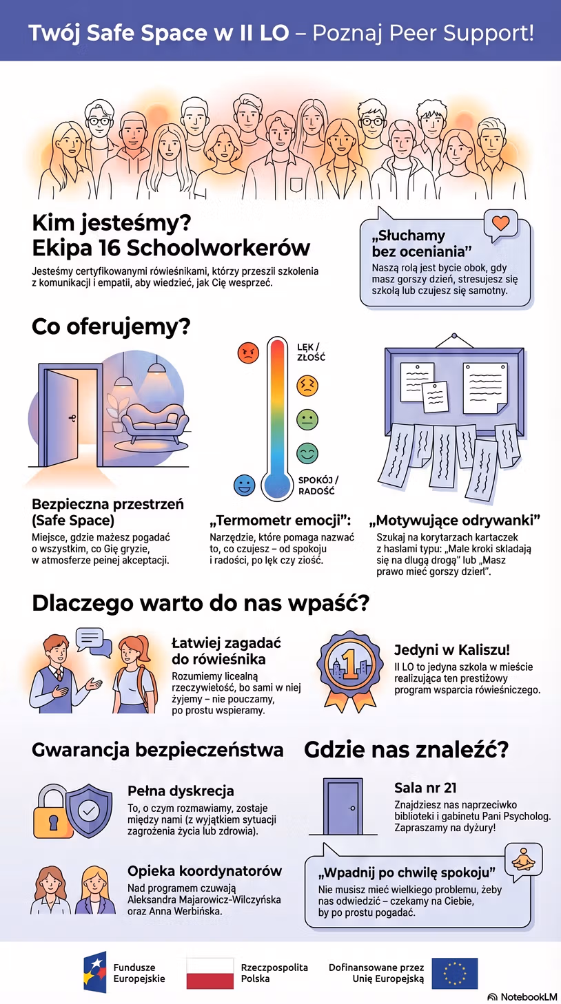 W poniedziałek, 8 kwietnia, mury II Liceum Ogólnokształcącego w Kaliszu stały się centrum regionalnej współpracy rówieśniczej. W ramach realizowanego w naszej szkole programu pilotażowego Peer Support, gościliśmy zespoły Schoolworkerów wraz z koordynatorami z zaprzyjaźnionych placówek w Ostrowie Wielkopolskim oraz Marszewie.Wizyta liderów i warsztaty rówieśnicze