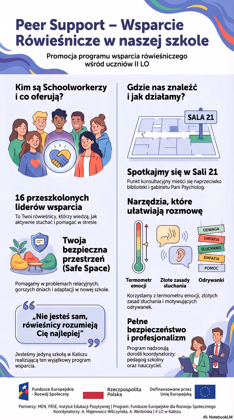 W środę, 25 marca, grupa uczniów II Liceum Ogólnokształcącego im. Tadeusza Kościuszki w Kaliszu, pełniąca funkcję Schoolworkerów w ramach programu Peer Support, uczestniczyła w wyjeździe studyjnym do Poznania. Wyjazd miał na celu integrację środowisk rówieśniczych oraz wymianę doświadczeń w zakresie wsparcia psychospołecznego w szkołach.Rozwój kompetencji i wymiana doświadczeń.